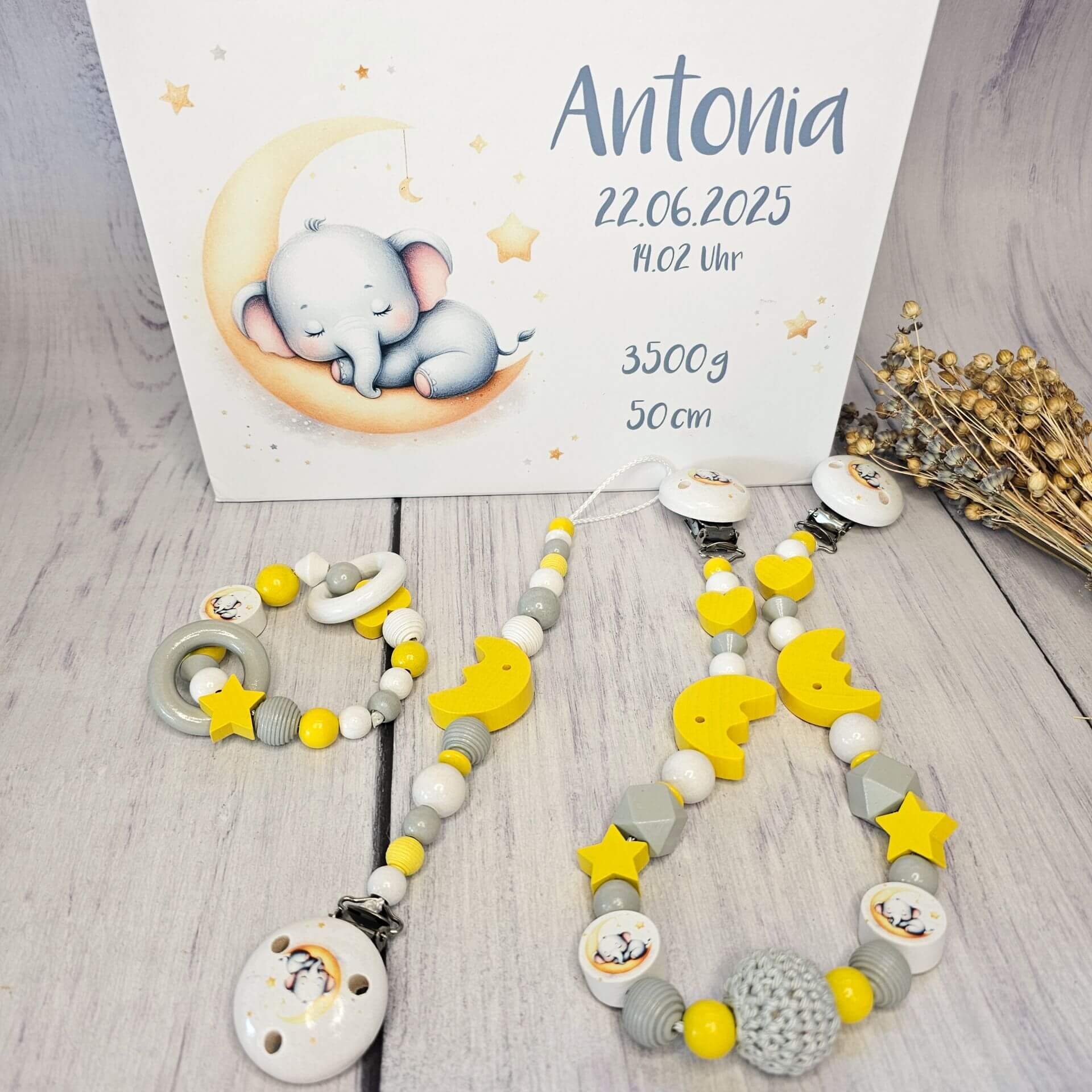 - Personalisierung: Wunschname, Datum, Uhrzeit, Geburtsgewicht und Größe