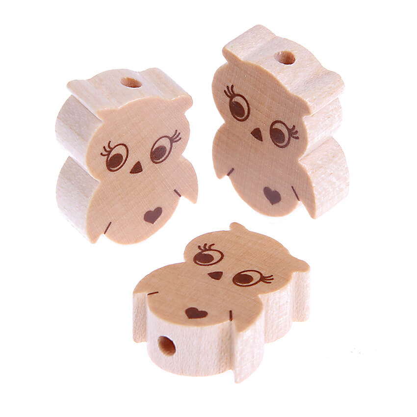 Motivperle Eule aus Holz zum Auffädeln ist zur Herstellung von Babyspielzeug, Kinderschmuck Schnullerketten, Kinderwagenketten und Mobiles gedacht. Die Motivperle ist auch für Anhänger und Armbänder geeignet.