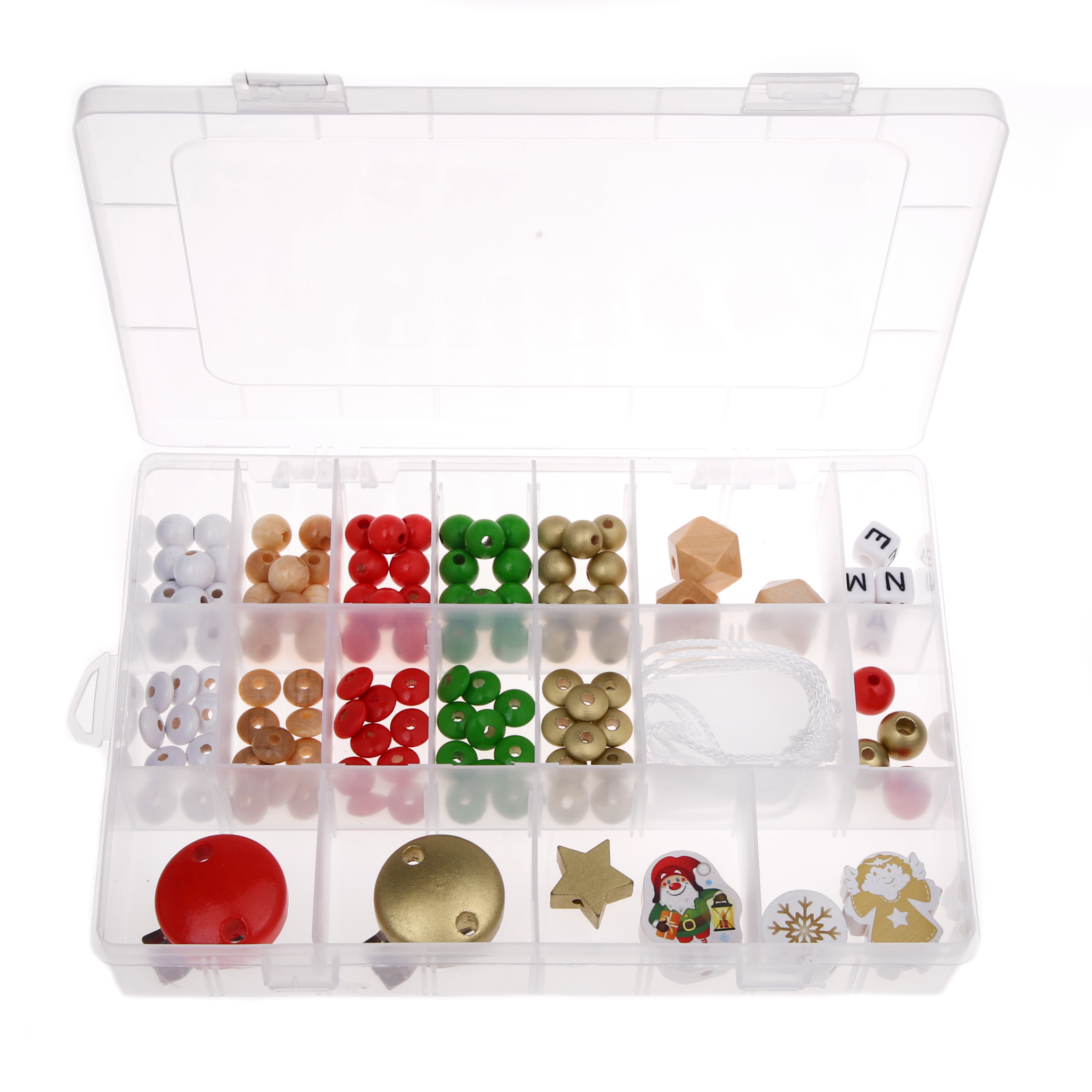 Immerse yourself in the festive spirit with our Christmas bead mix! This set contains everything you need to make your own festive creations. It includes motif beads with charming Christmas motifs and a sparkling snowflake. The beads come in the classic Christmas colors of white, red and green, which harmonize perfectly with each other.Contents bead mix:4 motif beads 25mm with Santa Claus, reindeer, gnome and snowman1 slice of snowflake15 grooved beads 14mm30 wooden beads 12mm60 wooden beads 10mm2m PP polyester cord Ø 1.5mm in whiteWith our Christmas mix, you can give free rein to your creativity and create beautiful, unique pieces of jewelry or decorations for the Christmas season. Murmelkiste craft kits are subject to the DIN EN 71-3 standard (new standard for migration of certain elements). All wooden beads, motif beads and clips are sweat-proof, saliva-proof and color-fast - so they are completely safe for babies' mouths.Craft set in individual parts is not suitable for children under 3 years of age - due to small parts that can be swallowed!Have fun crafting!