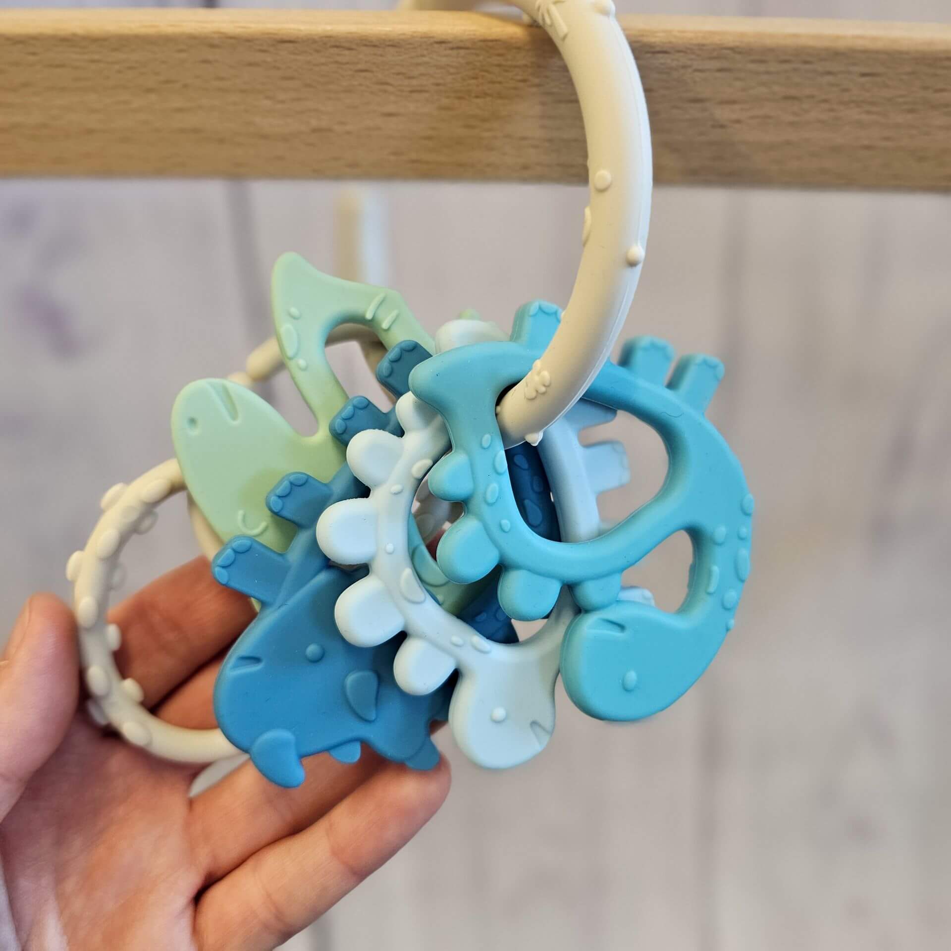 This cute silicone grasping toy with cute dinosaur motifs is the perfect companion for your baby's first journey of discovery. Made from high-quality silicone, it is particularly suitable for learning to grasp. The different shapes and structures of the little dinosaurs playfully promote motor development and stimulate the senses. Thanks to its handy size, the grasping toy fits perfectly in small children's hands and is a real eye-catcher both at home and on the go.