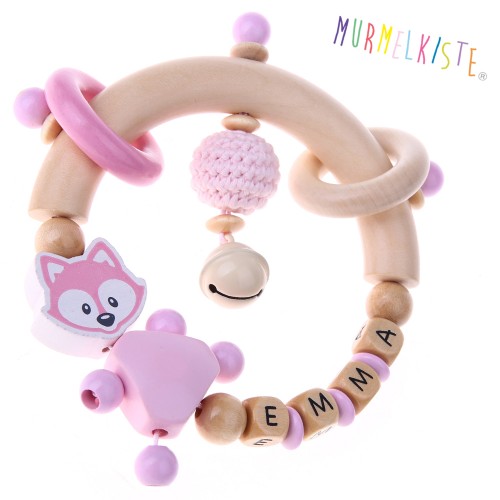 Cheerfully ringing and rattling, this fox grasping ring will make a child smile. The different wooden beads and wooden rings provide various stimuli and stimulation that babies can explore extensively with their fingers and hands. This grasping ring craft set can of course be personalized and modified according to individual preferences. There are no limits to your imagination. Have fun putting it together and customizing it! The craft set contains: 1x half ring (natural) 1x grasping toy mini (light gray) 1x mini grasping toy (gray) 1x triangular body (light gray) 7x safety bead (gray) 5x wooden lenses 10mm (natural) 3x wooden lenses 10mm (gray) 3x wooden beads 12mm (natural) up to 4 letters 10mm, embossed, wood (natural) 1x motif bead "fox" (gray) 1x crochet bead (gray) 1x little bell (silver) 70cm PP cord 1mm white Please note that we are using the new version of our wooden letters for this craft kit. You can find themhere Further motif beads can be ordered here.We provide help with making the grasping toy with our grasping toy craft instructions.The grasping toy craft set can be easily assembled and extended as required or supplementedwith our letter beads. High-quality woodwork (maple) made in Germany! This craft set is designed for making pacifier chains, baby carriage chains and mobiles for babies .It therefore complies with the DIN EN 71-3 standard (new standard for migration of certain elements). Therefore, all beads are sweat- and saliva-proof, color-fast and free of harmful substances - so they are completely safe for babies' mouths. ATTENTION: NOT SUITABLE FOR CHILDREN UNDER 3 YEARS OF AGE BECAUSE OF CONTAINABLE SMALL PARTS! (individual parts)