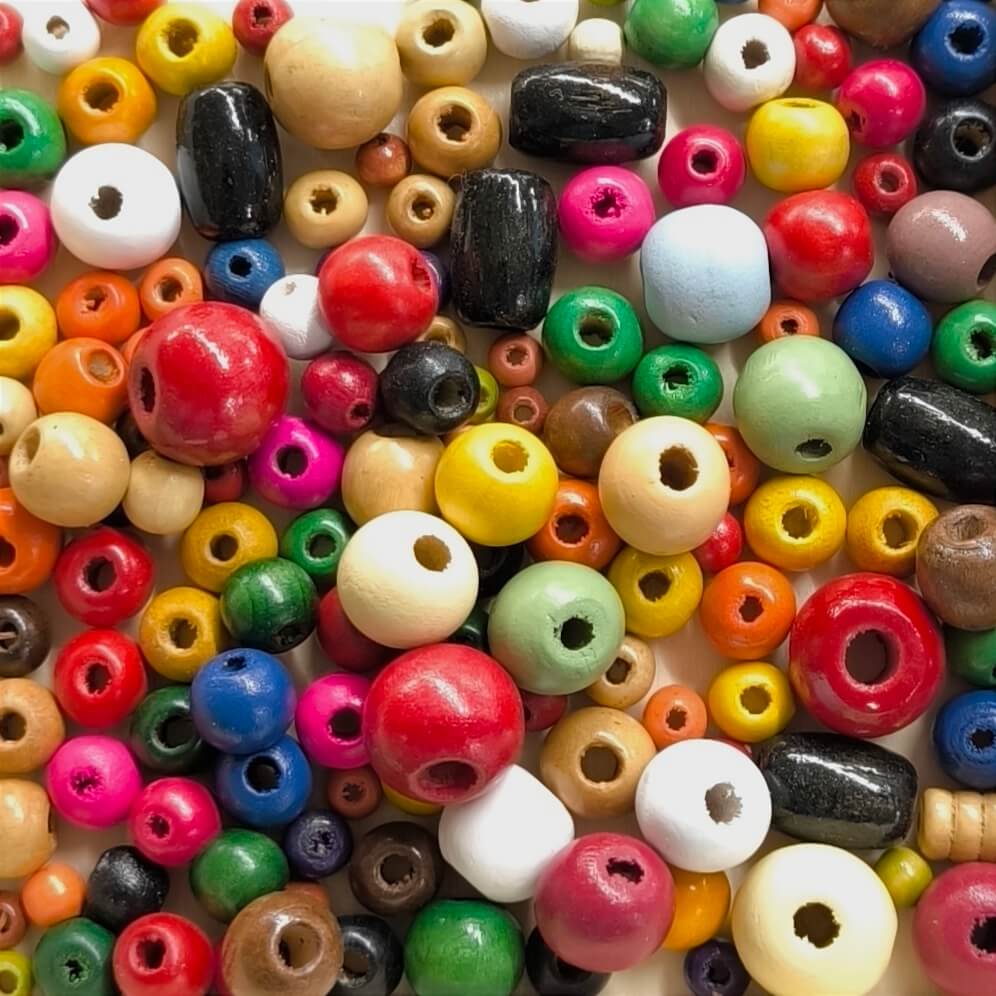 Holzperlen-Mix mit einer Vielfalt an Farben, Formen und Größen von 6 bis 16 mm. Dieser Mix enthält 40 Gramm bunte Holzperlen (ca. 200 Stück).