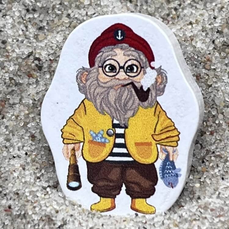 Der Klabautermann ist ein kleines graues Männchen mit meeresgrünen Augen und einem langen Bart in einem alten, wettergegerbten