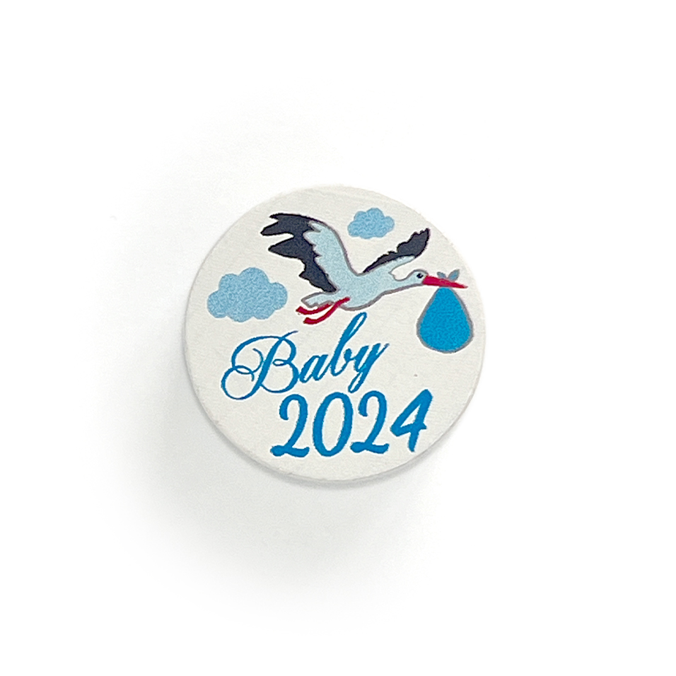 Unsere Motivperle „Scheibe Baby 2024“ in Scheibenform ist ein liebevolles Detail für Babygeschenke oder DIY-Projekte. Die Perle zeigt einen fliegenden Storch mit einem Bündel im Schnabel – das klassische Symbol für die Ankunft eines Neugeborenen.