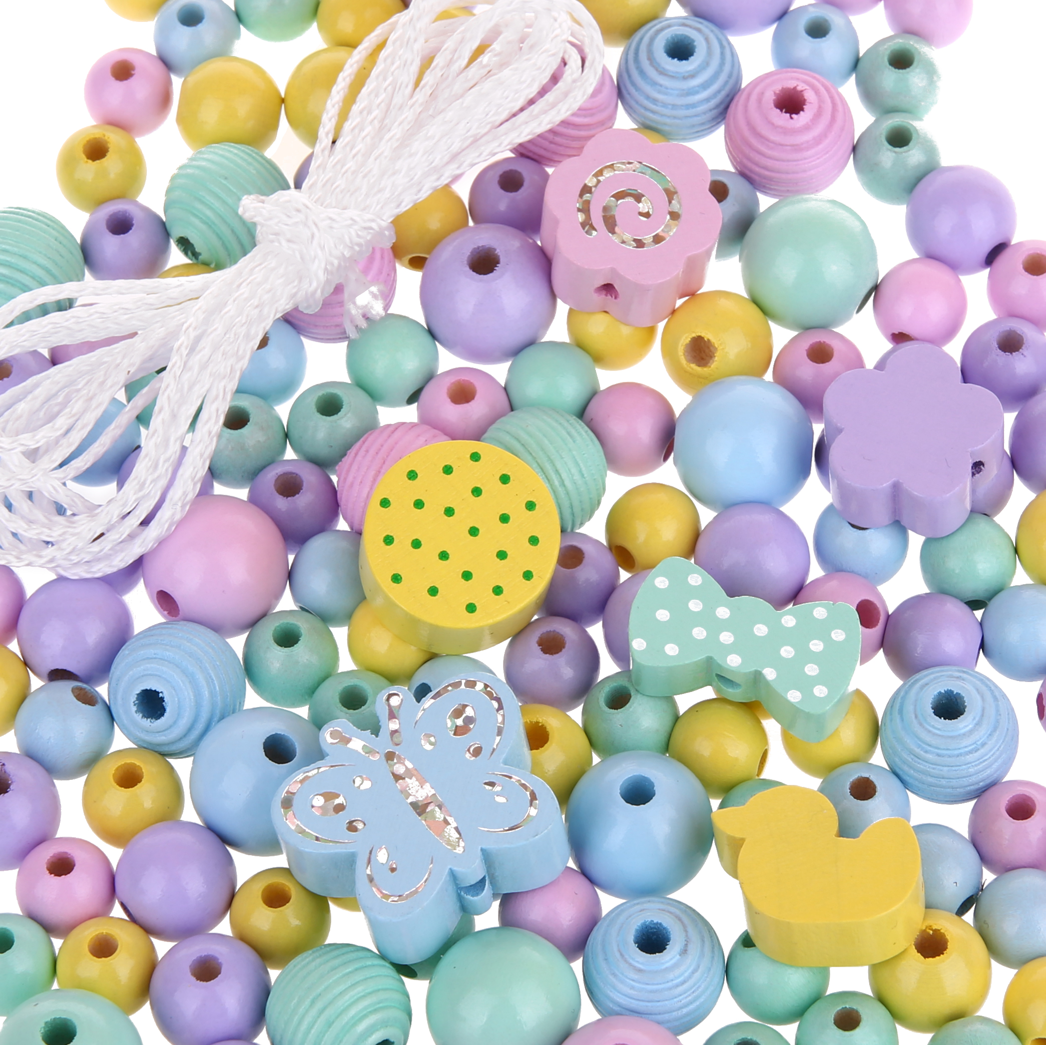 - 6 Motivperlen: Ente, Blume, Glitzerblume, Glitzerschmetterling, Schleife, Scheibe Punkte