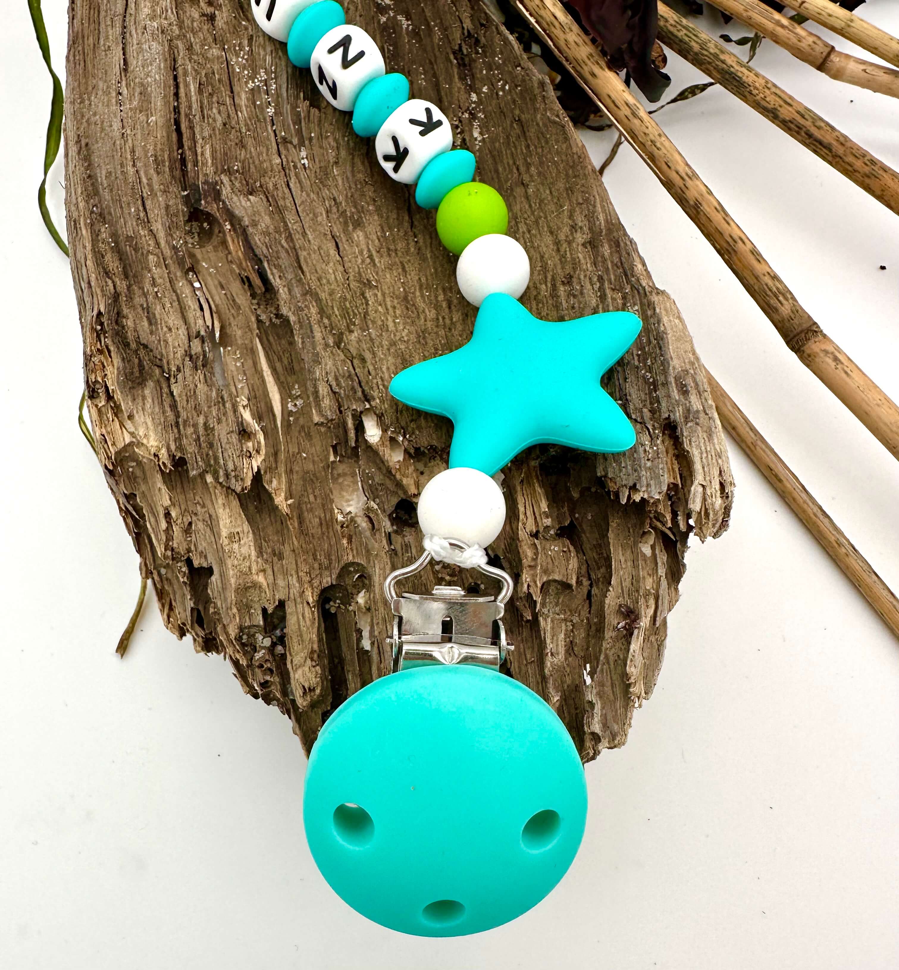 Das Silikon Schnullerkette Bastelset "helltürkis" kann einfach zusammengebaut und beliebig erweitert oder mit unseren Buchstaben ergänzt werden.